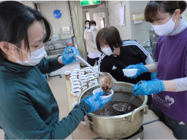 1月7日に少し早いですが、鏡開きのおぜんざいをいただきました。今年も安全に食べられるよう、小さな白玉入りぜんざいです。職員が丁寧に盛り付けます。