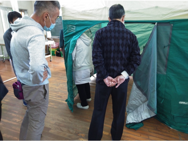 (性別のちがう利用者が療養する可能性も考慮し、シートによる仕切りとテントでベッドを分ける想定です)
