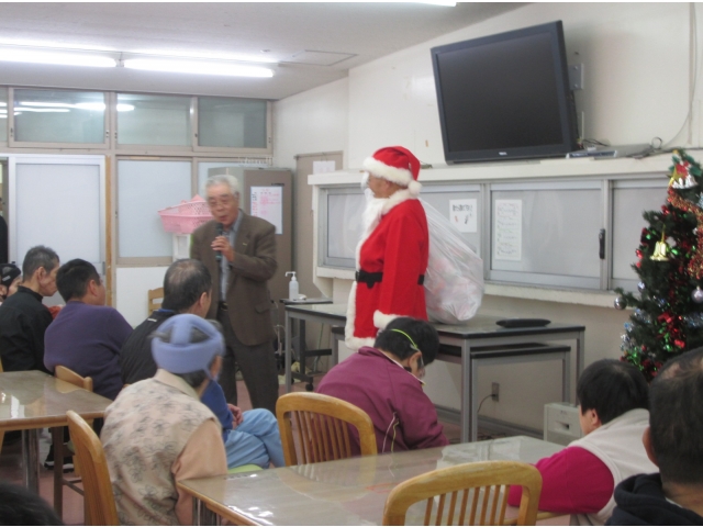 サンタクロースが利用者さんに、お菓子の詰め合わせをプレゼントしてくれましたよ(^^)(8分音符)