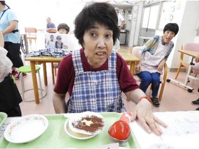午後からはいつものクッキングクラブを拡大し、利用者様にお手伝いいただいて抹茶ムースケーキにトッピング等盛り付けてもらいました。ココア・抹茶パウダーで星型・ハート・ネコのステンシルを使って模様付けしてさらにホイップクリーム・黒蜜・きな粉で思い思いの盛り付けをしていただきました。なかには、遠慮なく大量の盛り付けをする方も…!