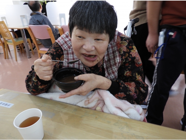 今月のクッキングクラブでは、鑑開きでおしるこを提供いたします。本物のお餅は危険なので、手作りの柔らかくて食べやすい白玉団子になっております。赤・白・緑でとっても綺麗です。