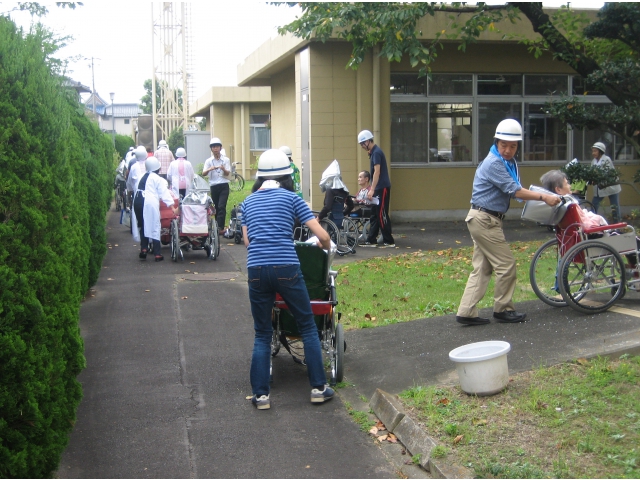 なお、地域の方々には車椅子の取扱説明をさせて頂きました。訓練後の感想を伺うと「車椅子介助は見た目、簡単そうだけどコツがいる」「坂の下り、舗装していない地面は介助が大変」「車椅子取扱い説明を前にやってくれて訓練の時、大変役に立った」と感想を聞かせて頂きました。