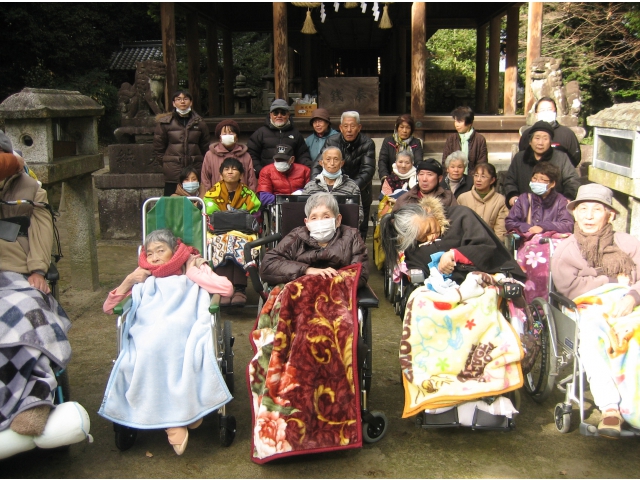 初春1月7日、寒風の中、利用者様11名とボランティア様8名、職員5名で神明社へ初詣に出かけました。当日の午後2時は、風も強く気温は6?。体感温度は、3~4?に感じる中、ダウンジャケット、膝掛やニット帽の防寒対策をしていきましたが、道中の約500mの道のりが大変長く感じられました。