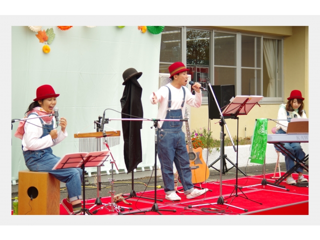 アトラクションのトップバッターは、音楽クラブ“ズッコケバンド”による演奏で、「森のくまさん」・アルプスの少女ハイジより「おしえて」の2曲を披露しました。「森のくまさん」ではメンバーがお面を被って森のくまさんと少女になりきり、手作りマラカスを振って会場を盛り上げてくれました♪