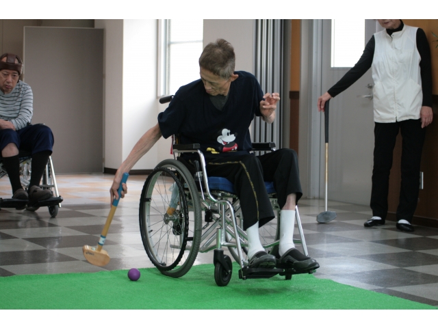 令和元年6月5日(水)、愛知県稲沢市祖父江町にある「領内グラウンドゴルフ」のメンバーをはなのきの里に招いて『パターゴルフ交流会』を開催しました。ロングコースとショートコースでパターゴルフを行いましたが、曲がるグリーン大苦戦しました。ボールがカップに入るたびに、歓声が上がり、声援が飛び交いました。ベストスコア賞は、「領内グラウンドゴルフクラブ」1名と「はなのきの里利用者様」1名が同点で獲得しました。パターゴルフを一緒に行うことで、地域の方々とよりよい交流になりました。