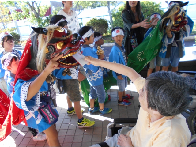 姿が見えないうちからどんちゃんどんちゃん♪と陽気な音と子ども達の楽しげな笑い声が聞こえてきて、利用者さんの期待も高まります。そしてついに獅子舞が姿を見せると「子どもたくさん来たよ!」「かわええなぁ」と大盛り上がりでした(^^)