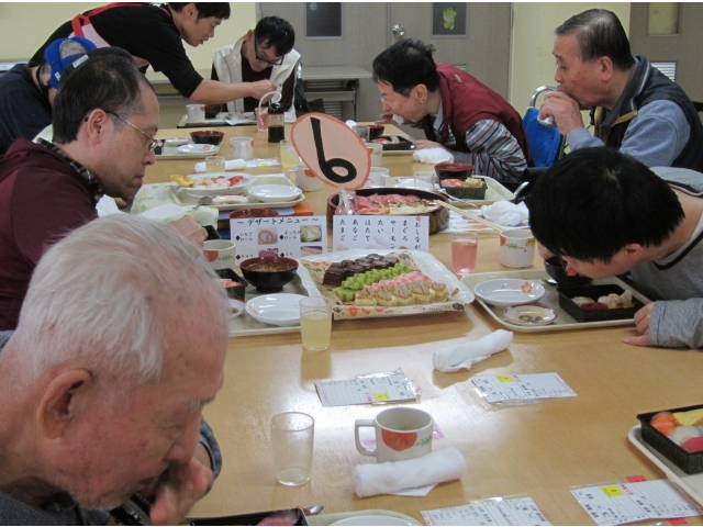まずは、第1部として「お食事会」の開催です。実行委員の利用者様のあいさつの後、寿司バイキングとデザートバイキングのスタートです!