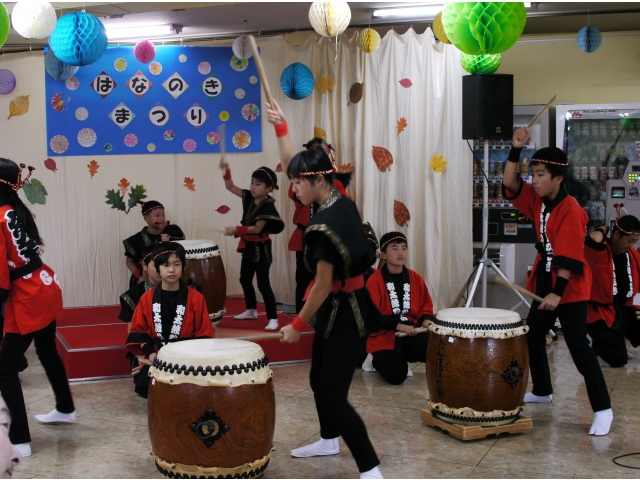 小さい子から大人まで一緒になって日本各地に伝わる和太鼓の楽曲を楽しんで演奏してくれました。