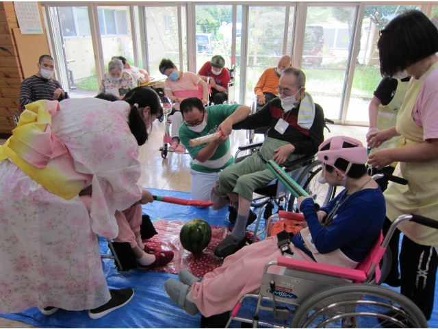 午後からはアトラクションで新規転入職員と利用者さんで力を合わせてスイカ割りを行いました。2チームに分かれての対抗戦!何やら負けると罰ゲームが・・・。