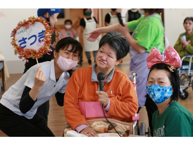 同時に開催していた「カラオケ大会」では、職員と利用者さんが一緒になって歌って踊ってその場は大盛り上がりでした。