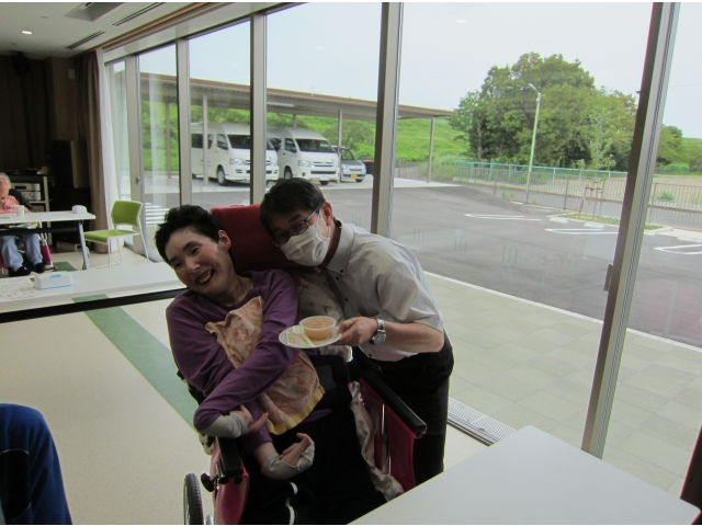 お誕生月の利用者さんの特別なお楽しみ、喫茶の時間帯を利用して月に1回設定されている『バースデイプレゼントDAY』 おしゃれなバースデイソングをBGMに、誕生月の利用者さんをお祝いしました!! お祝いアイテムのくす玉も大活躍!! お好みのケーキを頬張り、笑顔がいっぱい溢れていました~\(^o^)/