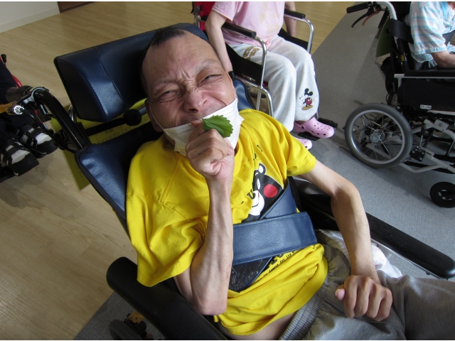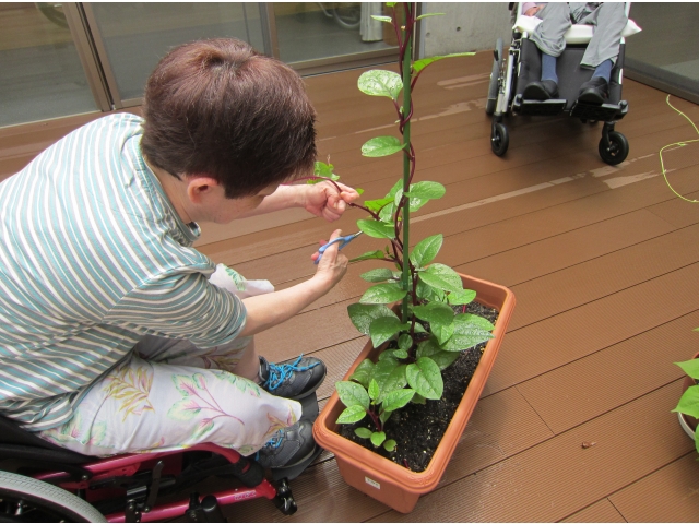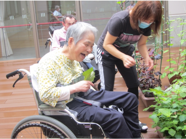 青じそを収穫して、ハーブの香りを堪能…。利用者のみなさんは「いい香りだね~」、「青じその天ぷらおいしいよね~」など青じそを手に会話が弾みました!!