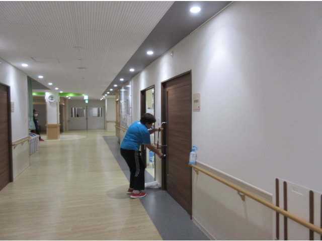 今回は、夜勤者が夜間巡回中に不審者を発見したという想定で、不審者の侵入防止と応援要請、及び利用者の安全確保ができるかどうかの模擬訓練。