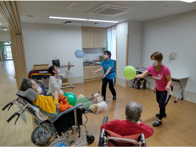 施設内を歩いていると、多目的室で風船バレーを楽しんでいる姿が目に飛び込んできました。 とっても素敵な場面!!急いでカメラを取りに事務所へ…。 みんなでワイワイ風船バレーを楽しんでいる姿を息を切らしながらも写真に収めることが出来ました!! 見ていたこちらも心がほっこりしました!