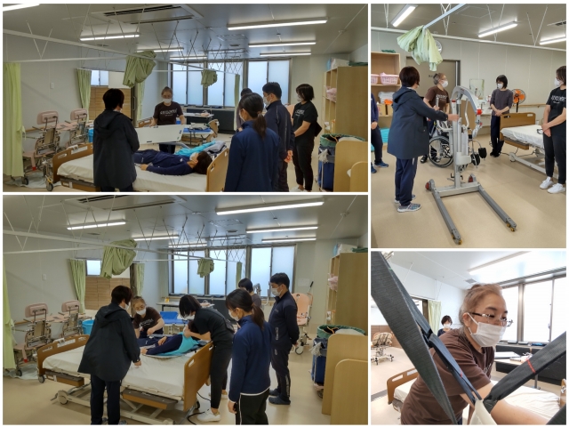 スライディングボードやリフターの取扱いについて見聞きして、実際に介助する側、される側の体験をしました。