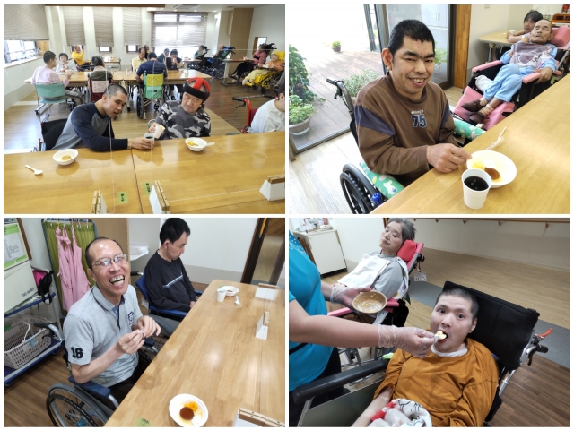 午後からは、「大玉運び」と「ジェスチャーゲーム」を行いました。またゲーム待機の間にはカフェタイムでプリンアラモードとドリンクが提供されました。