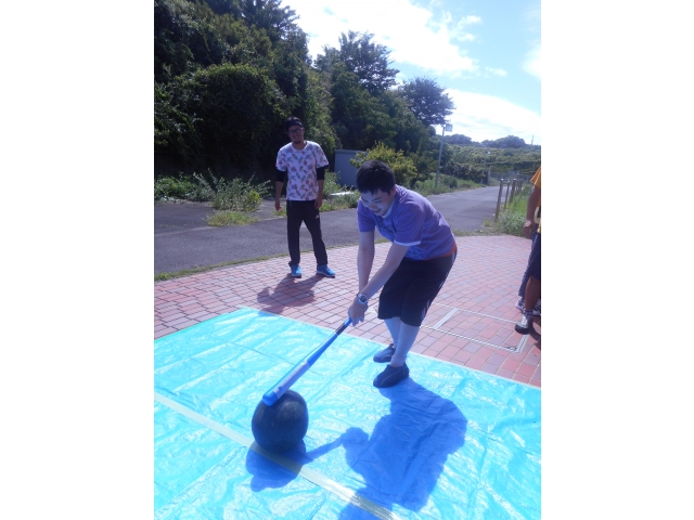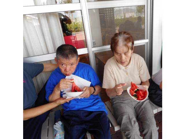 8月3日に1階で、8月8日に2階に分かれ、それぞれですいか割りをしました。なかなかうまく割れないすいかに対して、思いっきり叩く方や軽く叩く方いろいろいて、思い思いに楽しんでいました。日頃のストレス発散もこれでバッチリ?!割れた後は、もちろんみんなでおいしくいただきました(^-^)