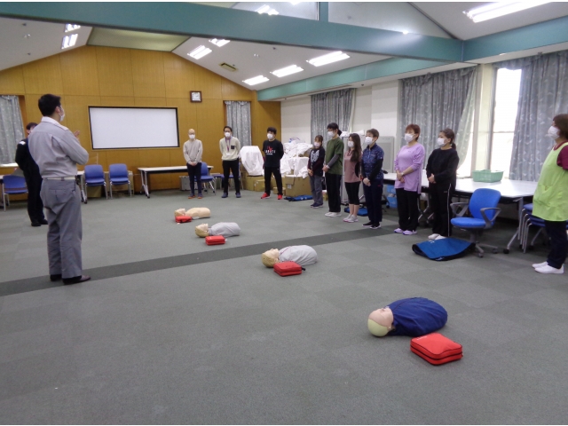 本日は救急蘇生研修として、成岩出張所の消防士を講師に招きました。