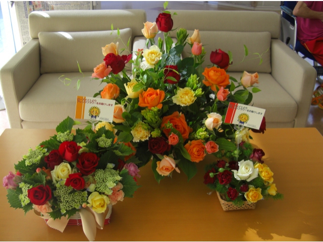 ひまわり農協のバラ部会様からいただいた、バラのアレンジです! 毎年この時期に寄贈して下さっています。 色や形もきれいですが、ほんのりと香りもいいんですよ! 玄関や食堂に飾らせていただきます。 あじさいと一緒に、梅雨のじめじめを吹き飛ばしてくれそうです。 ありがとうございました。