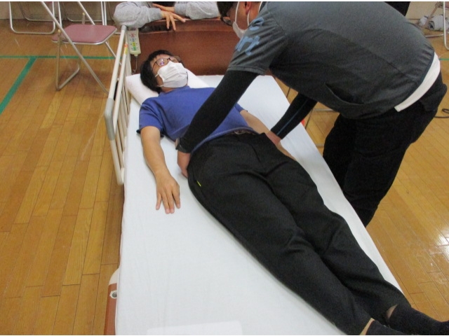 - 頭と肩の下に手を入れベッド奥へと→