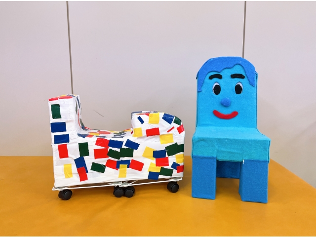 日中活動で制作した、牛乳パック使用のイスと車を、地域の保育園へ寄贈しました。一緒に制作を行ったご利用様2名と訪問しました。