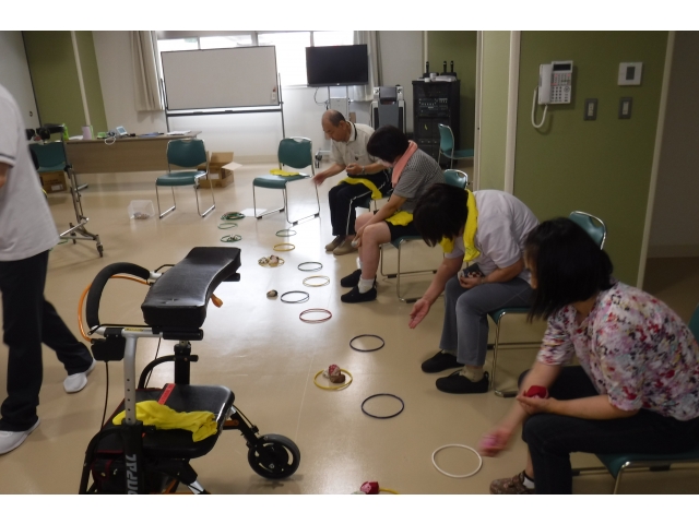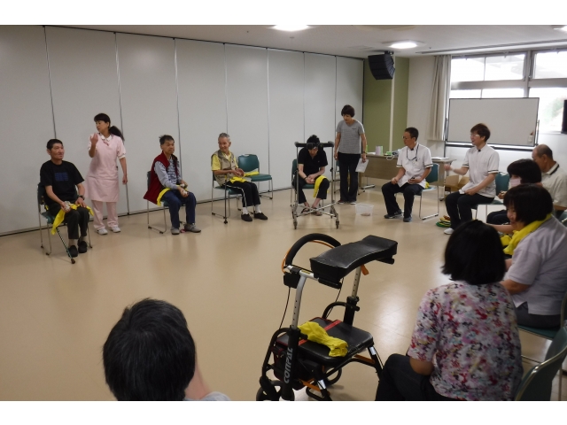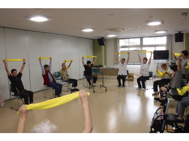 愛知県済生会リハビリテーション病院の理学療法士の皆様が、利用者様対象の転倒予防体操のレクチャーに来寮されました。利用者様のADL低下の防止と健康増進のために、このようなレクリエーションを行っています。