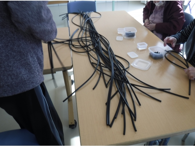 利用者様の自立支援の一環として、自動車のウォッシャーホースの部品取り付け作業を行っています。出来上がった製品は利用者様の工賃として配当され、利用者様の就労意識の向上を図っています。