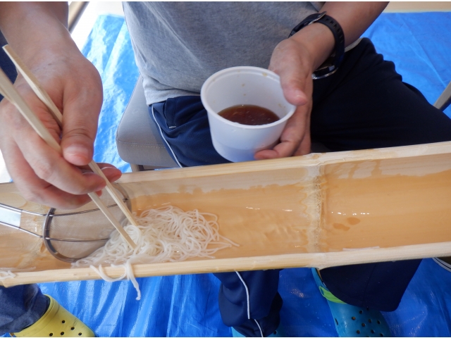 第4回目の最終日は、梅雨も明けたかのような快晴でした。しかし、とても気温も高いため、室内にて涼みながらの開催となりました。今年最後の流しそうめんであり、とても賑やかに楽しんでいただくことができました。