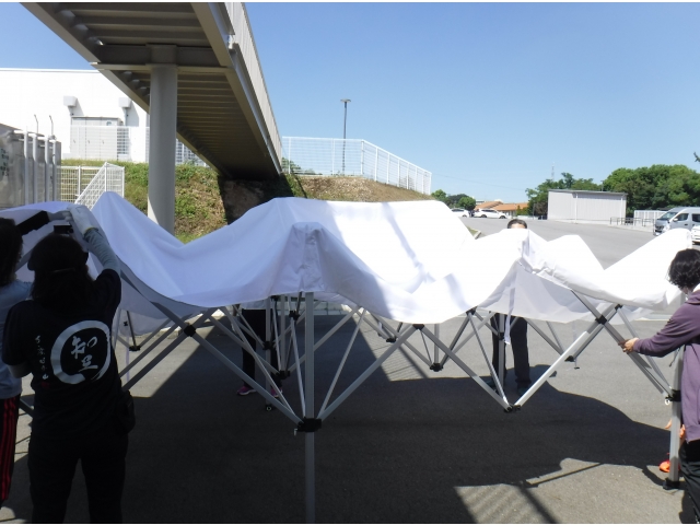 今年は職員による簡易トイレとワンタッチテントの組み立てを行いました。簡易トイレは普段組み立てることはまずありません。初めて組み立てた職員が多くいました。
