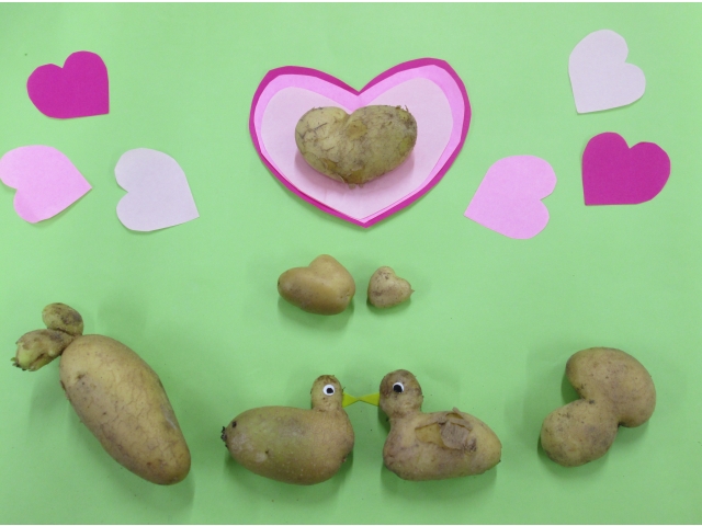 草に負けずに育った、たくましいジャガイモ達を、無事に掘り出すことができました。作業始めは、連日の蒸し暑さであまり乗り気じゃなかったご利用者様達も、土の下からゴロゴロ出てくると「おー!沢山あるよ」「こっちにもいっぱい♪」と収穫を楽しまれる声があちこちから聞かれました。その後、袋詰めしていると、なんだか可愛いらしい形の芋がちらほら…!?売り物にはならないので、この場を借りてお披露目しま~す。