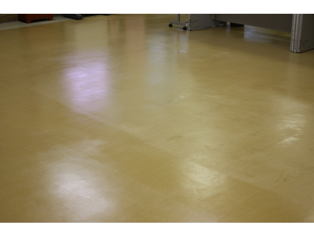 今回は最初に床面を剥離し、汚れを落としてからワックスを掛けるということで、きれいな床面にワックスが乗るので、とても綺麗な仕上がりになっています。