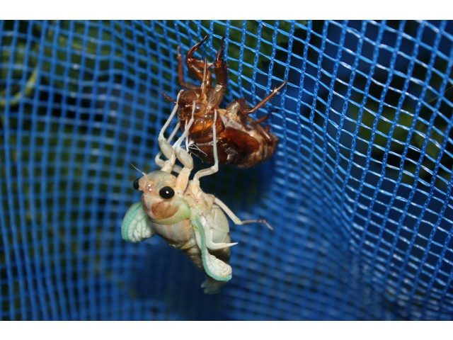 金曜日の夕方、薄暗くなりつつあるすぎのきの里の庭で、アブラセミの羽化が始まりました。時間をかけてゆっくりと羽を伸ばしていきます。その様子を利用者さんと一緒に観察しました。無事に飛び立ったのか、翌日には抜け殻だけが残されていました。