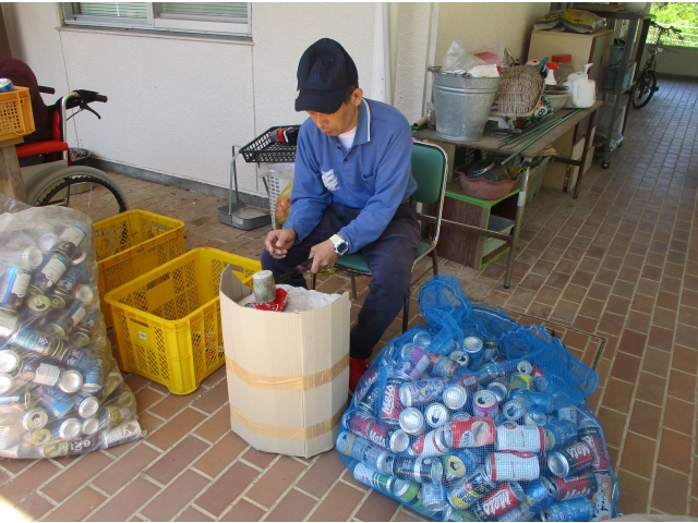 雲一つない青空の下で、「缶つぶし」を行いました。
