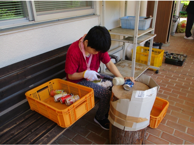トンカチで思いっきりつぶしたり、道具を使ってつぶしたり、みなさん真剣な表情です。