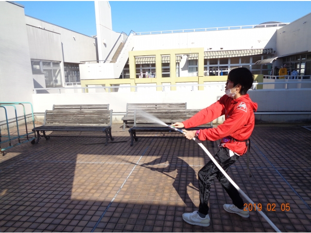 消化用散水栓からホースを使用しての消火活動を行いました。