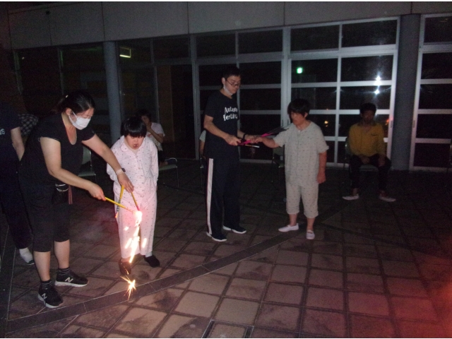 花火の火が怖くてなかなか近づけない方もいる中、中には花火に興味津々ではしゃぎまわる方、手を叩いて喜びを表現される方など様々な反応が見られ、職員一同企画してよかったと感じております。