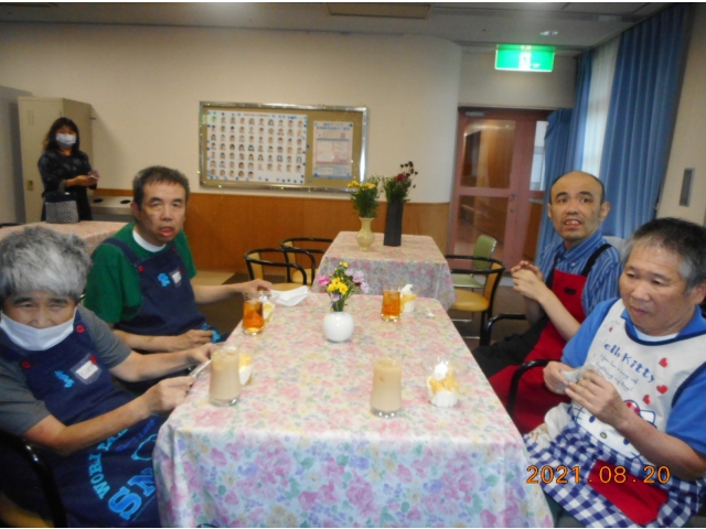 コロナの影響で中止されていたおやつ作りがワクチン接種が済んだこともあり、久しぶりに再開しました。久しぶりのおやつ作りにみんな楽しそうな表情でした。みんなで盛り付けをしたら豪華なパフェが出来上がりました!みんな「おいしい、おいしい」と言って召し上がっていました。また次回もおいしいおやつが作れるといいですね。