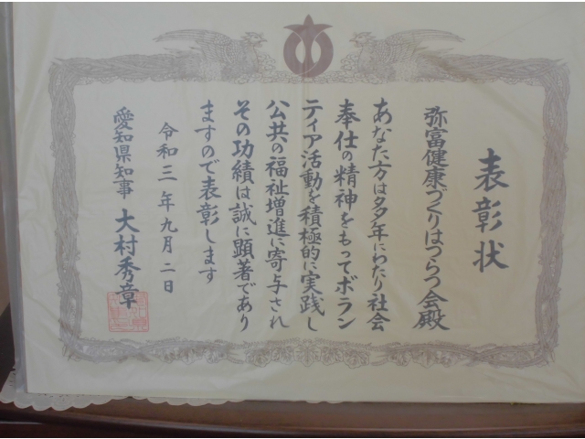 当施設で20年以上の永きにわたりボランティア活動(利用者様への体力づくり体操)のご尽力をいただいている団体様に愛知県から表彰状が贈られました。 本来は県庁にて知事から授与のところ緊急宣言に伴う中止のため施設でのお渡しとなったのが申し訳ありませんでしたが、この場を借りて改めて感謝の意を伝えさせていただきました。 感染収束の時期がきましたら、ご活動再開のお申し出をお待ちしております。