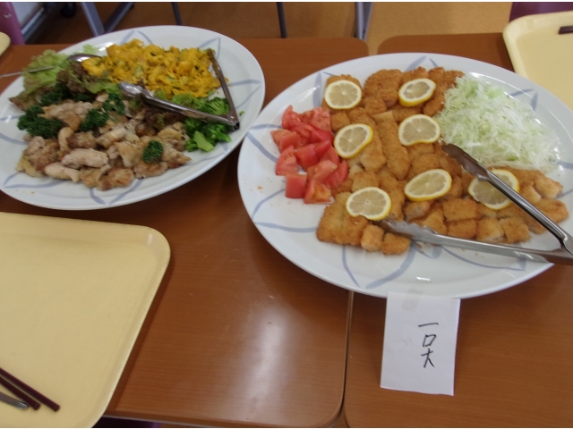 今日は、昼食バイキングの日でした~☆メニューは、くりごはん、えびカツ、ローストチキン、サラダ、デザートです!皆さんとても楽しみにしていました~!お腹いっぱいでもう食べられませーん♪とてもおいしかったでーす☆
