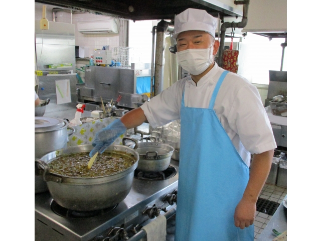 本日の昼食は人気メニューのカレーライスです。なす、トマト、ズッキーニ、枝豆、とうもろこし・・・沢山の夏野菜を仕込みます。