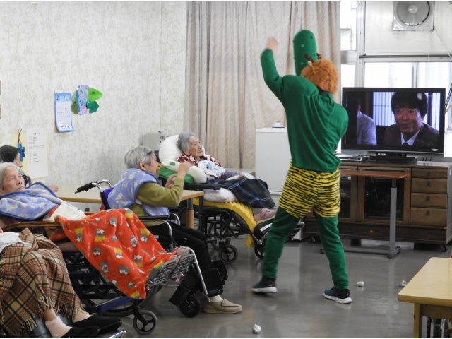 利用者の皆さんのもとへ突入すると、待ってましたとばかりに豆(ボール)を投げつける皆さん。