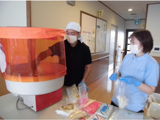午前の部では、七輪で秋刀魚・松茸・焼き芋を焼き、たこ焼き、わたがしなど利用者の前で作りました。