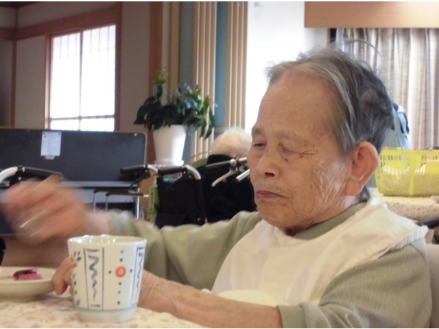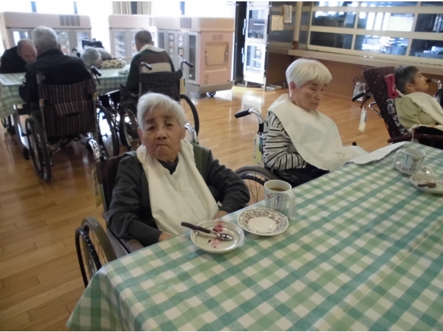 今回は、2丁目の方42名の方に食堂の会場まで来ていただきました。普段過ごされている2階デイルームとは違った雰囲気で、皆さんお好みのデザートやお飲み物を楽しまれました。