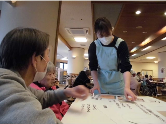 1丁目は、回想法(昭和時代に関する3択問題)を行い、昔のことを思い出したり、懐かしんでいただきました。「なつかしい」や「チキンラーメンは昔は高価だった」「チキンラーメンのタマゴポッケはいつからあるのだろう?」「私は大正生まれだから昭和のことはわからないわ」などなど、皆さん昭和を懐かしみ、話に花が咲きました。