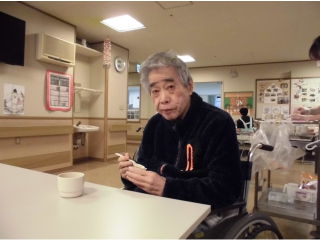 その後は、お待ちかねのおやつタイムです。煎茶と和菓子風ムース(ふんわりきなこ)を提供しました。嚥下に配慮されたムースだったので、皆が同じものを食べることができました。とても美味しかったようで、皆さんペロリと完食されていました。