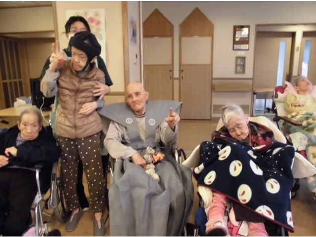 苑長の挨拶、年男・年女の紹介をし、いよいよ鬼の登場。
