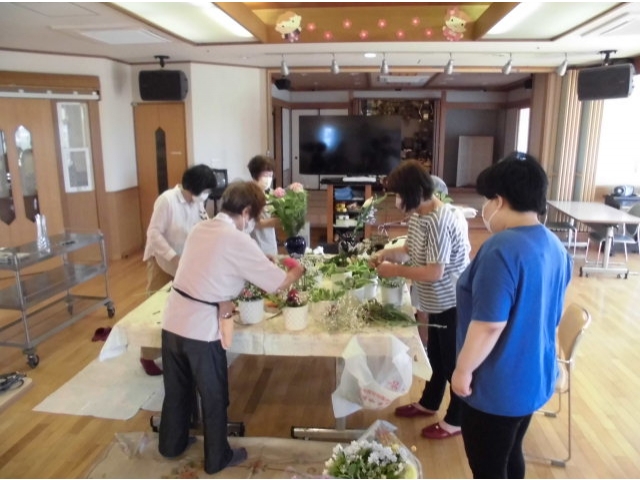 6月8日、ボランティア共和グループ様のご厚意でお花を生けて頂きました。 2階から階段で降りてくるとお花のとても良い香りが広がっていました。見渡すと苑内のいたるところに色彩豊かな季節のお花が飾られていました。 「アジサイの季節ですね。」「とてもきれいです。」「贅沢な気持ちになります。」など利用者さんや職員から喜びの声がたくさん聞こえてきました。