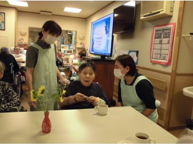 1丁目は、願い事の書かれた短冊を読み上げ、七夕にちなんだ映像を視聴しました。その後、七夕祭りや盆踊り大会などでよく使用される、荻野目洋子さんの『ダンシングヒーロー』に合わせて皆で楽しく踊りました。
