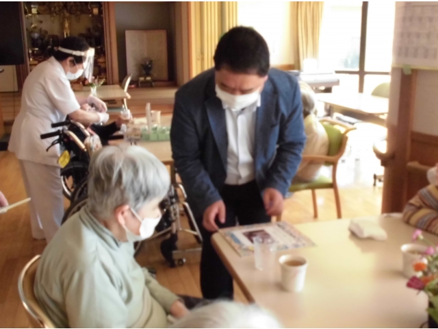 苑長から挨拶のあと、誕生月の方へ色紙をプレゼントし、ノンアルコールビールやりんごジュースで乾杯を行いました。