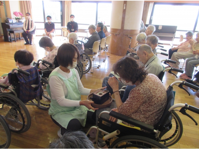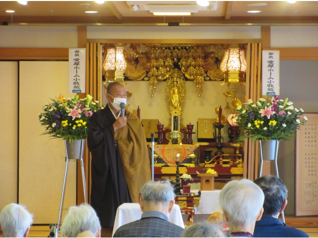 9月6日(金)、小牧苑では秋の彼岸法要を行いました。 龍洞院のご住職にお経を唱えていただき、利用者の方々と職員全員で故人のご冥福をお祈りしました。 最後にはご住職からのありがたいお話を、みなさん真剣に聞いておられました。